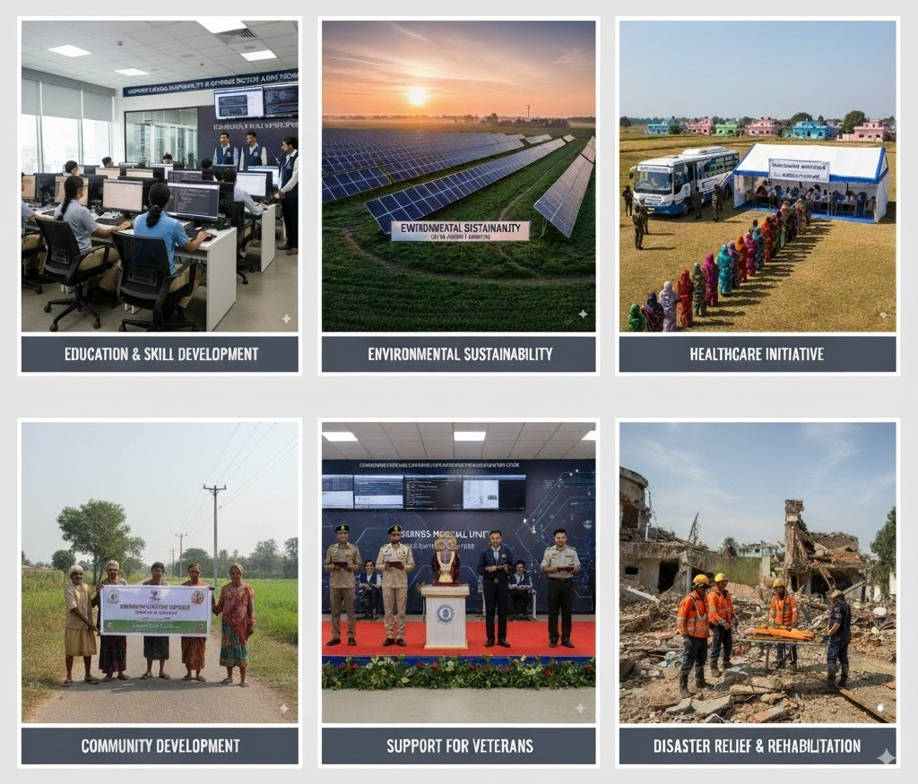 Our Corporate Social Responsibility framework encompasses six key focus areas: Education & Skill Development, Healthcare Initiatives, Environmental Sustainability, Community Development, Support for Veterans, and Disaster Relief & Rehabilitation. Through these comprehensive programs, we create lasting positive impact across diverse communities throughout India.