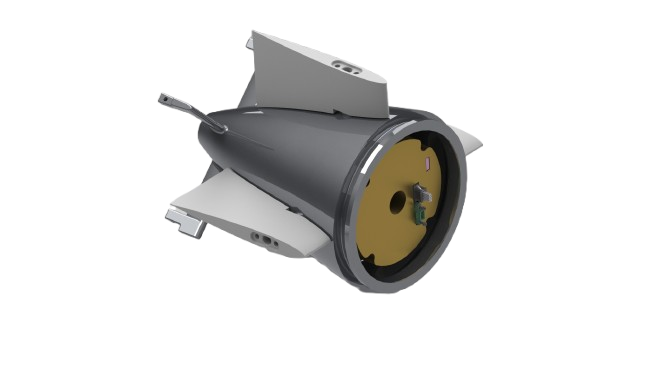 The Actuator System Assembly (SWARM) is designed to deflect the control surfaces of the AUV based on command voltages provided by the On-Board Computer (OBC). Positioned at the tail section of the torpedo body, the system comprises four actuator sections, each equipped with one actuator and one potentiometer. Two actuators control the horizontal rudders (elevators), while the remaining two control the vertical rudders. This configuration ensures precise control of the AUV’s movement and stability.